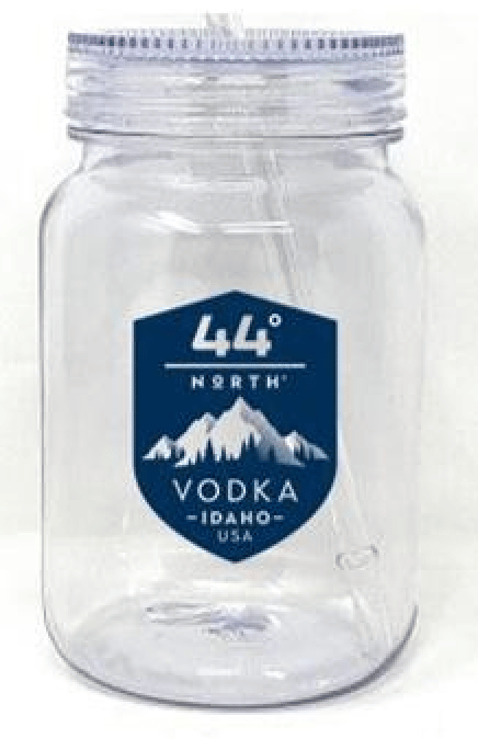 This is a custom designed mason jar tumbler, complete with straw and 44º North® branding. Now your cocktail is boat, beach and pool safe. 44° North Vodka Brand Shield on the front, farm to glass on the reverse. Sold as a set of 4.